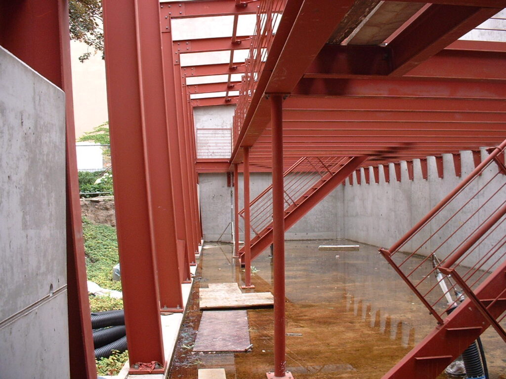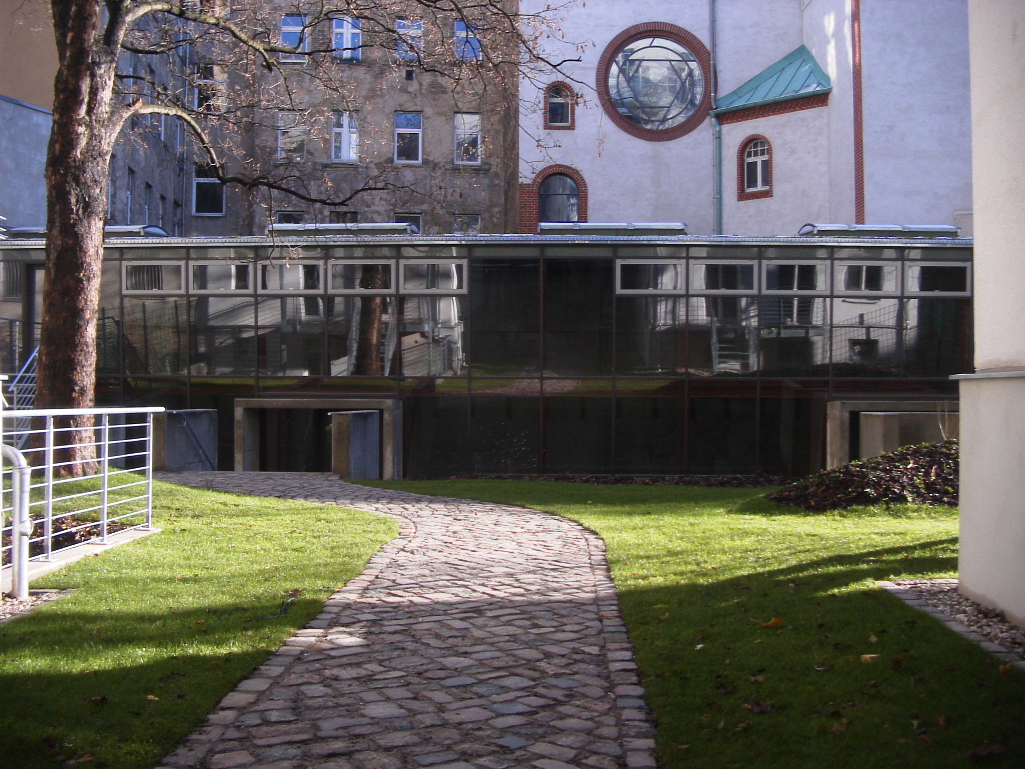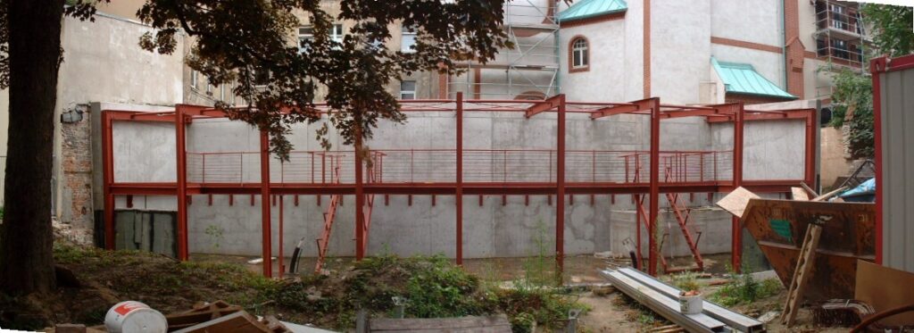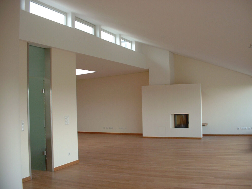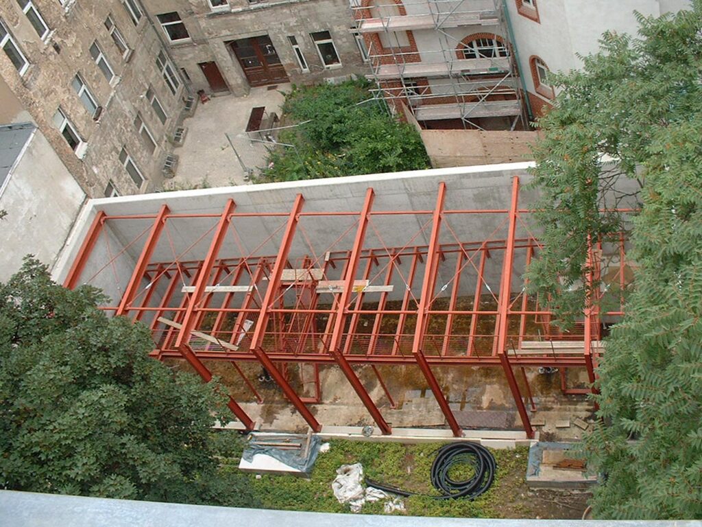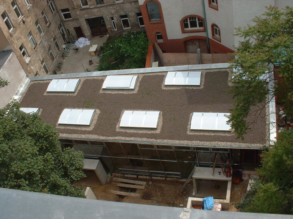 Anstelle des nicht mehr vorhandenen Werkstattgebäudes auf dem hinteren Grundstücksteil wurden dort in Stahlbauweise über zwei Geschosse offene Gewerberäume mit Galerieebene errichtet.