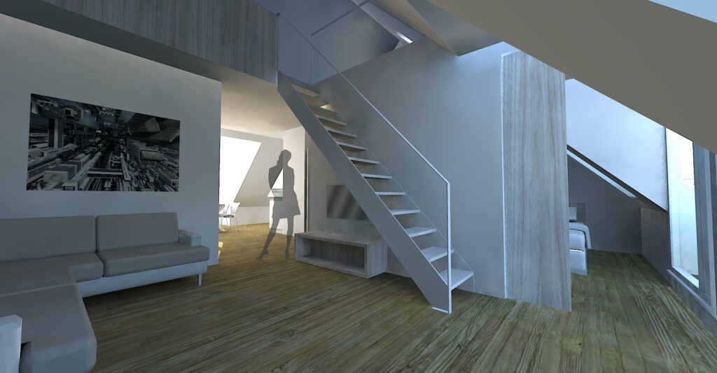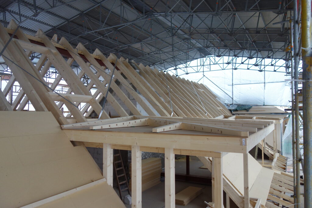 Die bautypische Satteldachform einschließlich Traufhöhe und Dachneigung wurde nicht verändert. Gauben auf beiden Dachseiten erweitern die Wohnfläche. Die zum Wohnraum offenen Spitzböden dienen als zusätzlicher Stauraum.