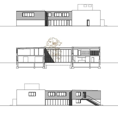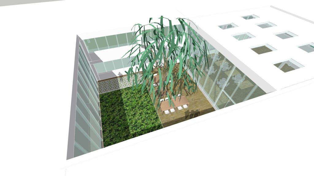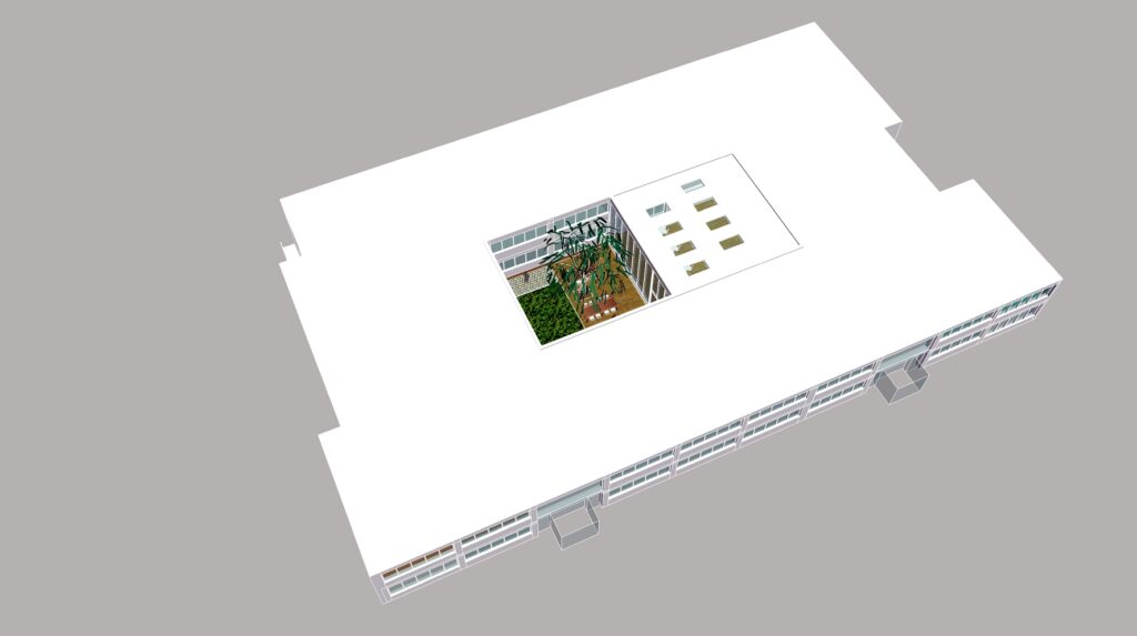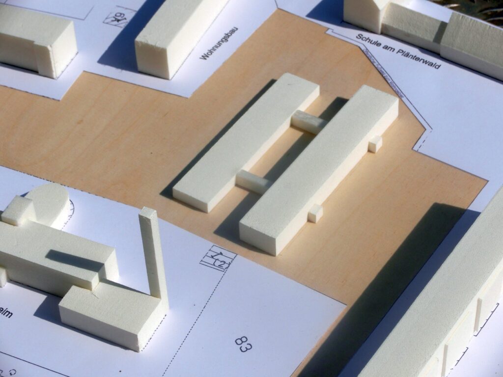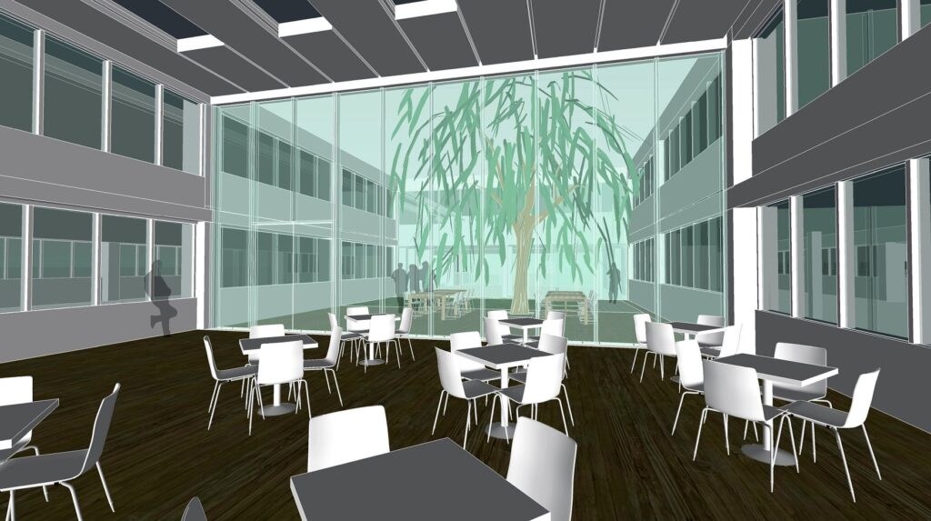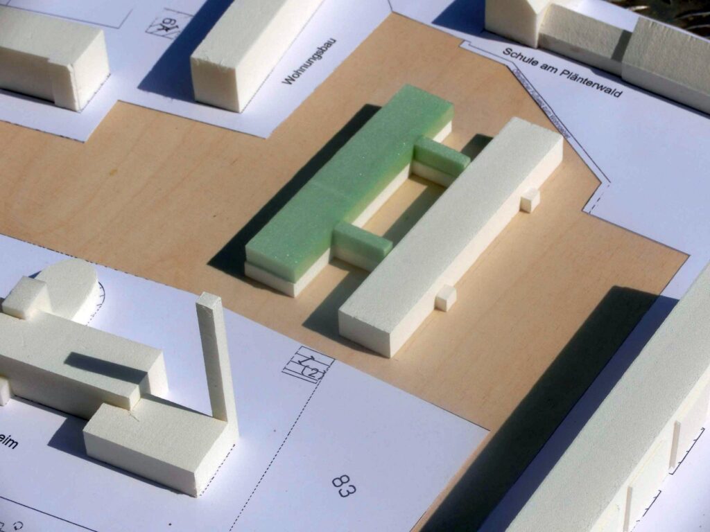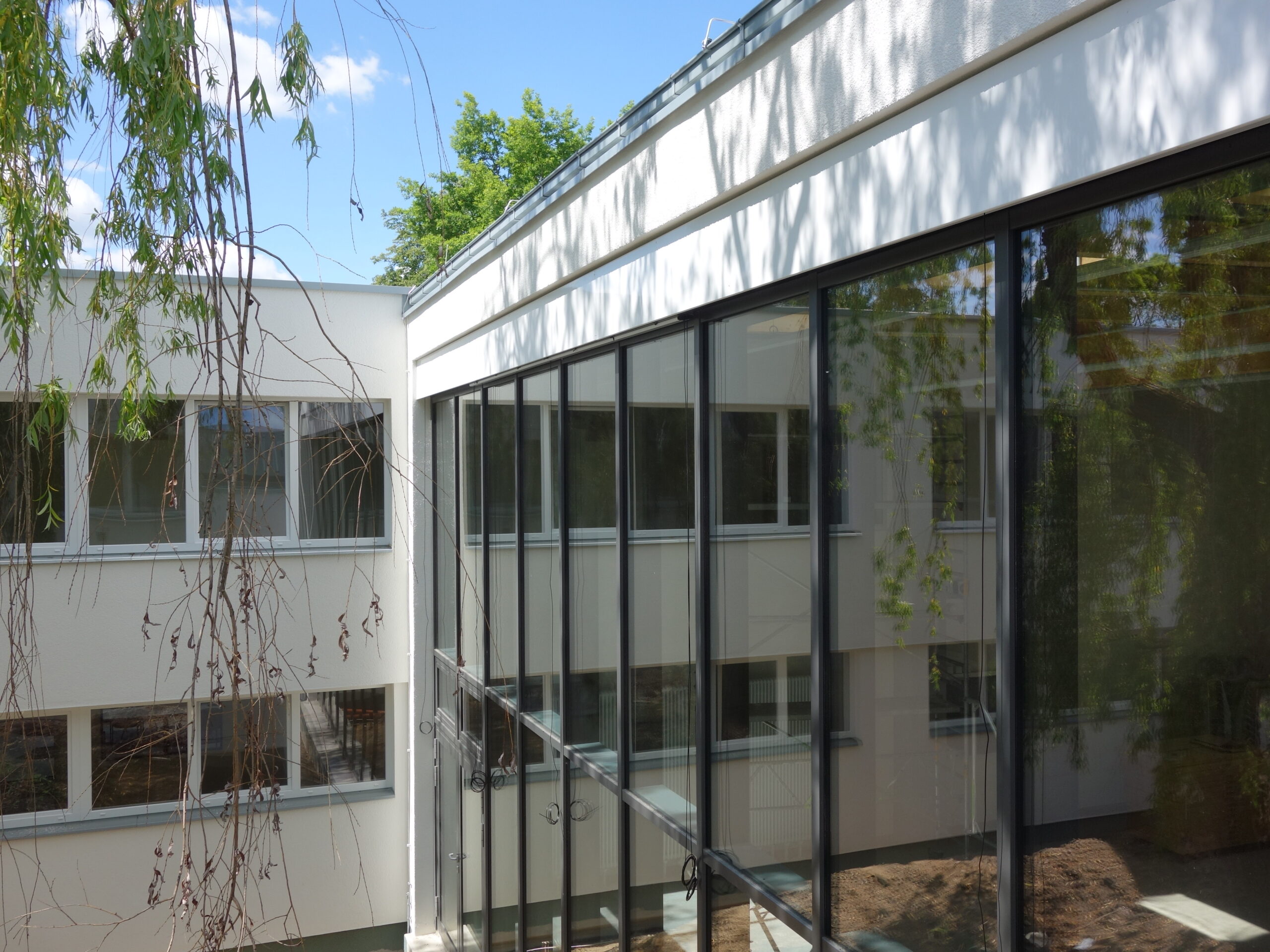 Der hintere eingeschossige Gebäuderiegel wurde um ein Geschoss erhöht und mit dem vorderen durch zwei Baukörper verbunden, wodurch sich ein geschlossener Innenhof bildet. Die Brutto-Grundfläche vergrößert sich damit um ca. 1.400 m² auf etwa 3.500 m².