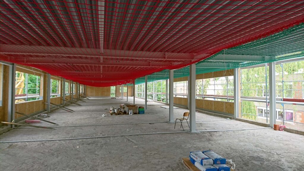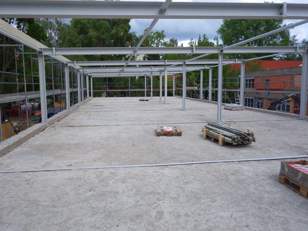 Die Verbindungstrakte wurden als Stahlbetonskelett errichtet, die Aufstockung erfolgte aufgrund der geringen Lastreserven in leichter Bauweise mit tragenden Stahlrahmen. Als Außenwände sind vorgefertigte Holzrahmen-Elemente vor die tragende Skelettkonstruktion montiert. Die flach geneigten Dächer bestehen aus Stahltrapezblechen auf Stahlträgern bzw. Leimholzbindern.