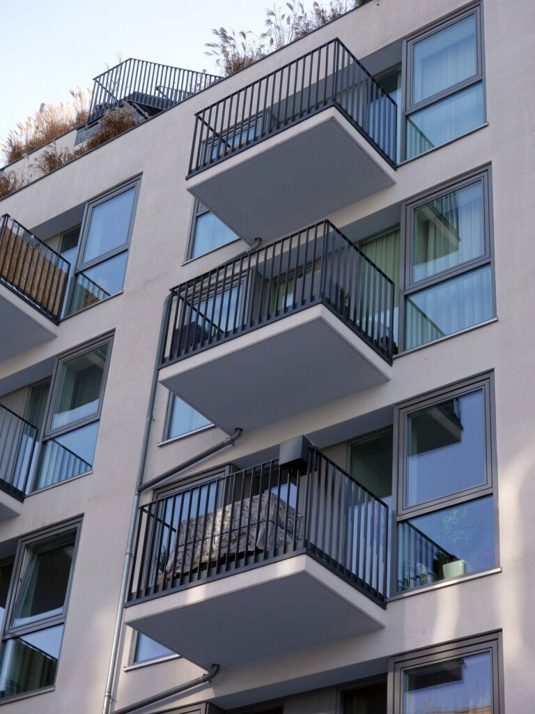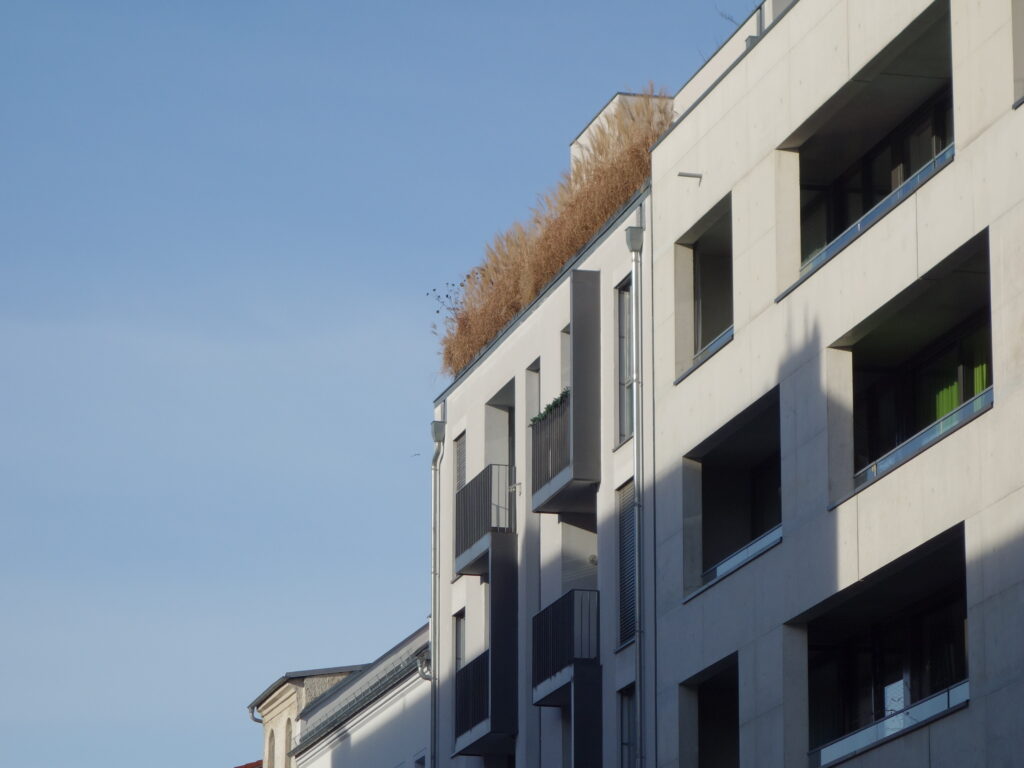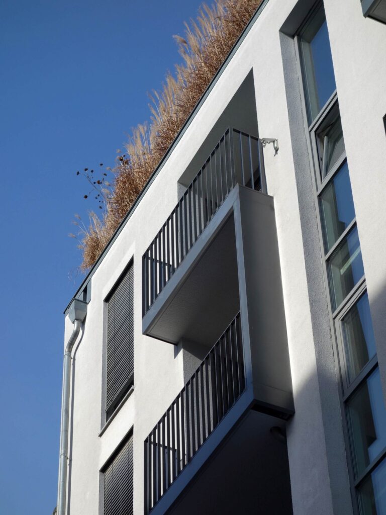Alle Wohnungen verfügen sowohl über eine Loggia in der Straßenfassade als auch über einen Balkon an der Gebäuderückseite. Die obere Dachfläche ist über eine außenliegende Treppe zugänglich und wird als Dachgarten genutzt.