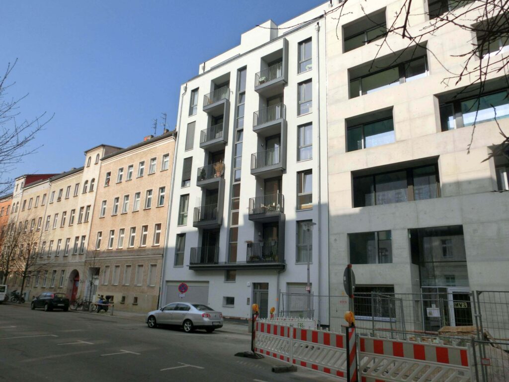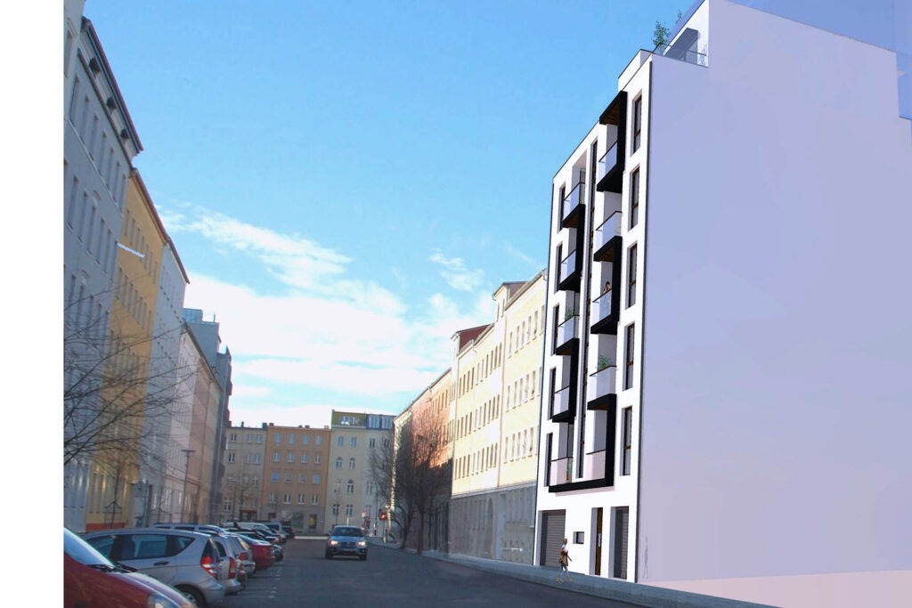 Das Gebäude ist Teil der Wiederherstellung eines durch Krieg und Abriss stark aufgebrochenen Blockrandes. In 6 Vollgeschossen und einem zurückgestaffelten Dachgeschoss entstanden 11 Wohneinheiten, davon eine Maisonettewohnung mit Gartenzugang und 6 PKW-Stellplätze in einem Doppelparksystem.